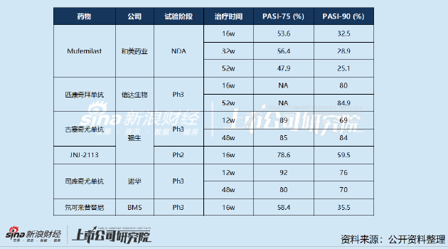 可比竞品中,信达生物的匹康奇拜单抗在16周的PASI-90为80%,PASI-75未统计;强生的JNJ-2113在16周的PASI-75和PASI-90分别为78.6%、59.5%;BMS的氘可来昔替尼在16周的PASI-75和PASI-90分别为58.4%、35.5%,数据表现均优于Mufemilast。