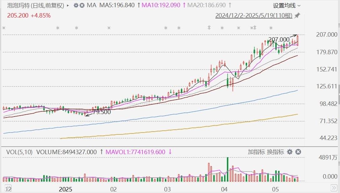 虽然此次未被调入恒生指数成分股,但不改上升走势!泡泡玛特(9992.HK)今日再度走强,盘中一度涨5.77%,报207港元,再创历史新高,市值升至2780亿港元。泡泡玛特年内已累涨129%。