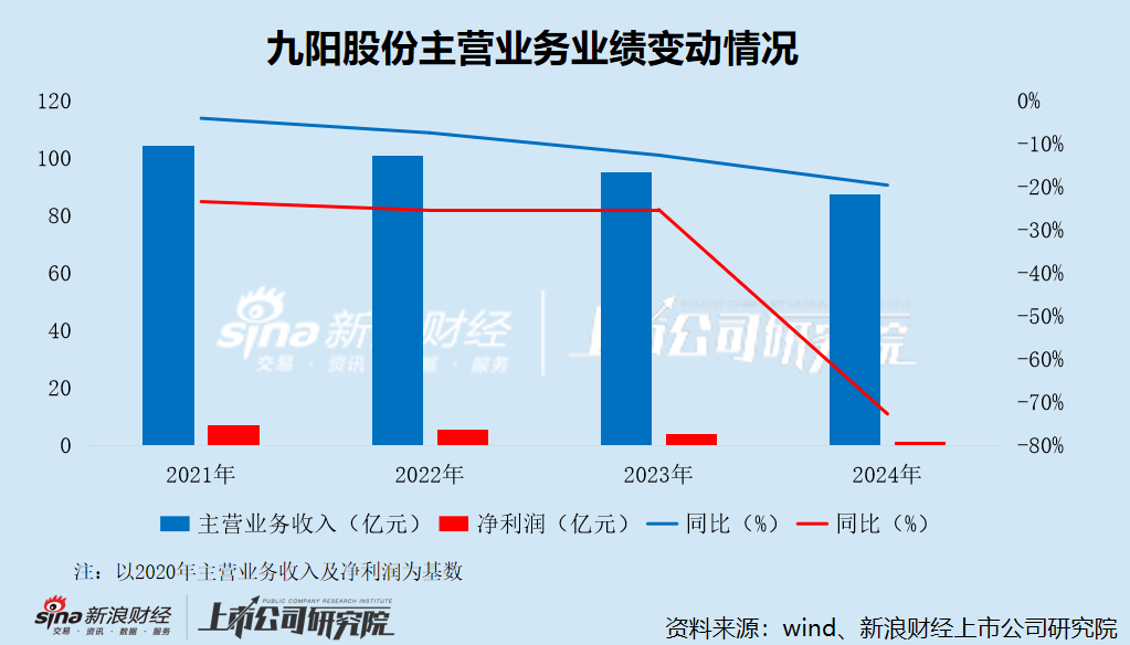 2021-2023年,九阳股份分别实现主营业务收入104.34亿元、100.67亿元、95.02亿元,较2020年减少4.11%、7.48%、12.67%;录得净利润7.01亿元、5.23亿元、3.91亿元,较2020年减少23.47%、42.90%、57.31%。