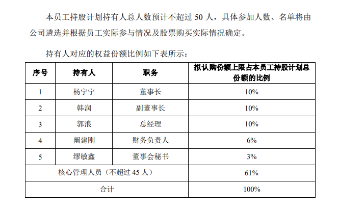 第一次修订后,草案新增持有人名单,董事兼总经理杨宁宁、财务负责人阚建刚、董事会秘书缪敏鑫3名高管拟认购19%份额,核心管理人员(不超过27人)拟认购81%份额。同时,员工持股计划受让价格由0元/股增至1元/股。
