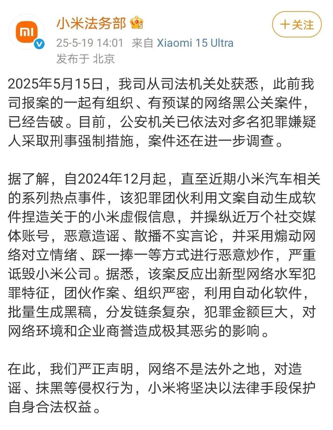 小米法务部:此前报案的一起有组织、有预谋的网络黑公关案告破,犯罪团伙操纵近万账号恶意造谣、诋毁小米