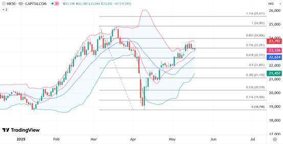 上周受到贸易局势缓和的推动,港股成功收复4月初失地,恒指周线上涨2%,为连升5周,周一开盘情绪收到外围美国被下调评级的影响,但是预计很快随着市场消化港股仍有望保持上行动能,关注来自10日均线及布林带中轨的重要支撑,阻力继续维持在上周主要交投区间,区间顶部的阻力在23700上方。