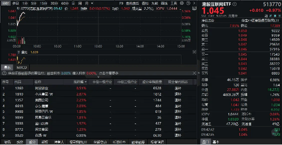 重仓港股互联网龙头的港股互联网ETF(513770)开盘小幅下探后迅速走高,场内价格现涨0.97%。