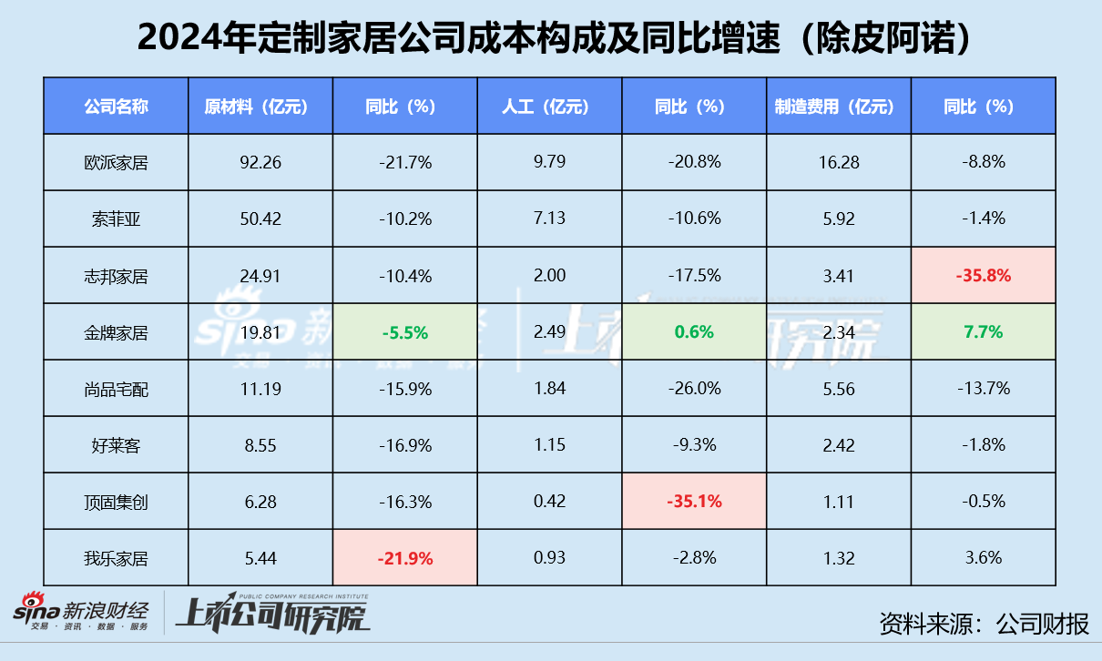 剔除成本分类略有不同的皮阿诺,其余8家定制家居公司营业成本皆由原材料、人工和制造费用构成。