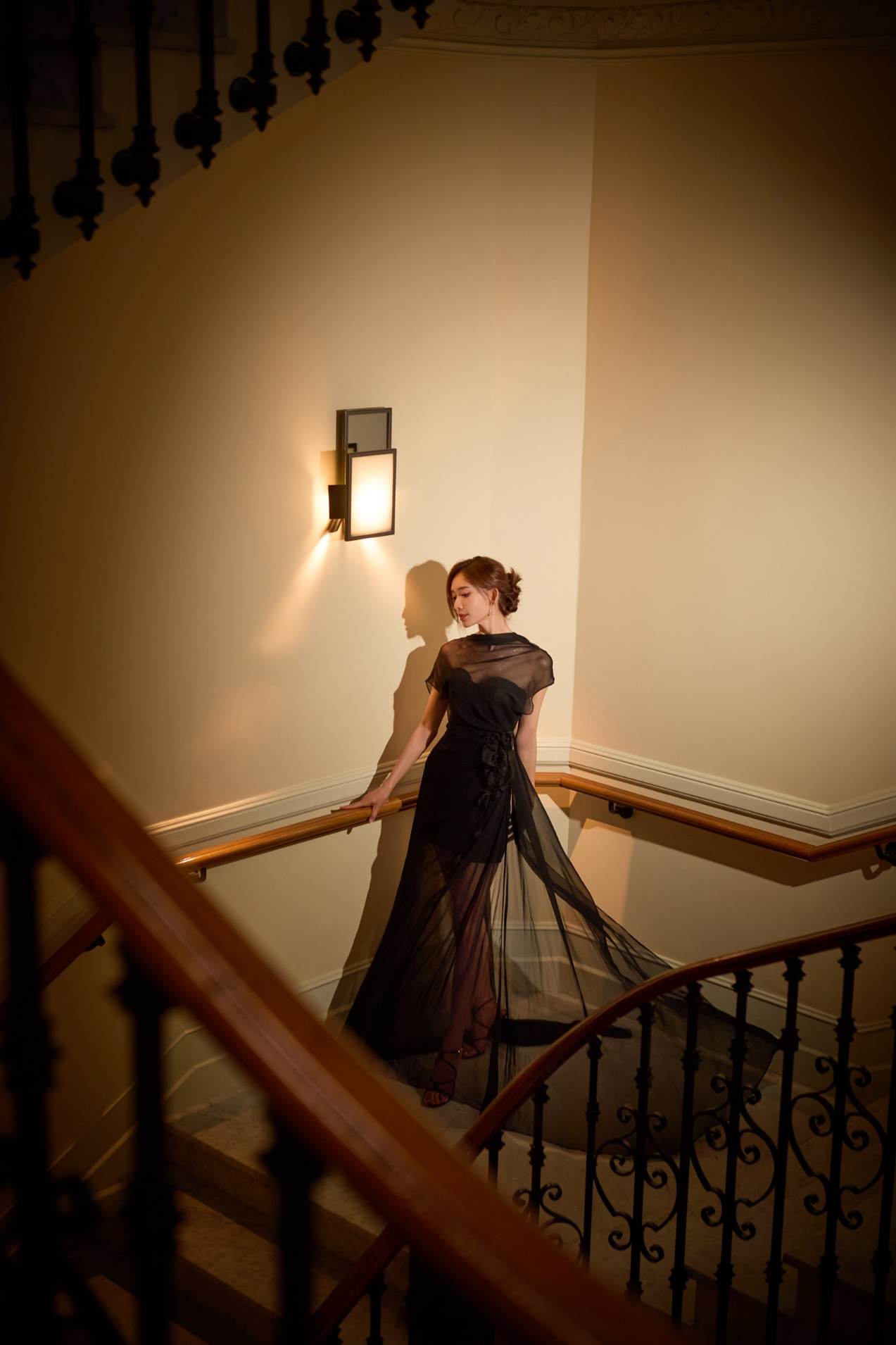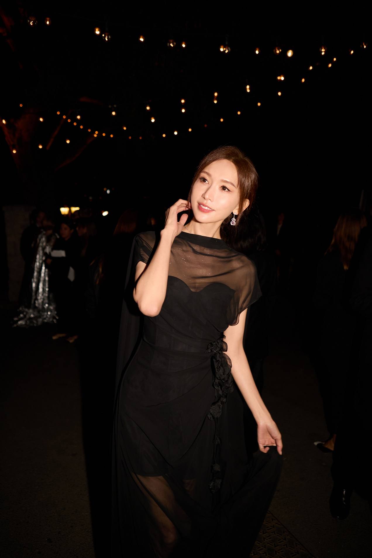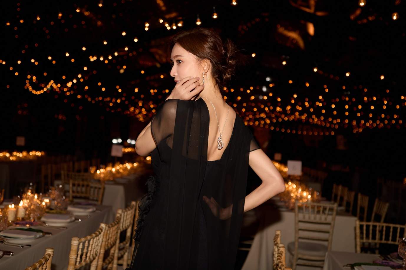 林志玲的优雅如经典斗篷焕发奢雅,蝴蝶兰在烛光下熠熠流转;光影旖旎,朦胧的黑纱晕染着一层光韵,La Koradior拉珂蒂高定礼服与林志玲辉映星光,与浪漫氛围融为一体,宛如电影镜头下神圣的女神。