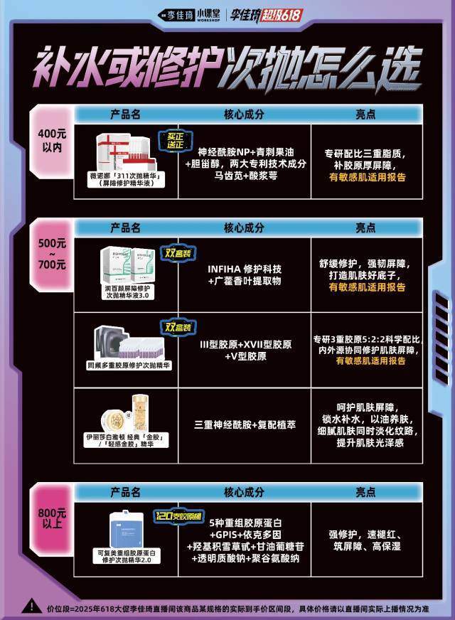 “次抛是精华的另一种形式,独立包装的呈现方式适合一些容易失活的成分以及旅游、出差等消费场景。”李佳琦在本次618的美妆小课堂当中推出了“次抛攻略地图”,将产品分为祛痘、保湿修复、美白提亮、抗皱紧致等多个细分功效,整体客单价在100-2000元左右的价格区间。