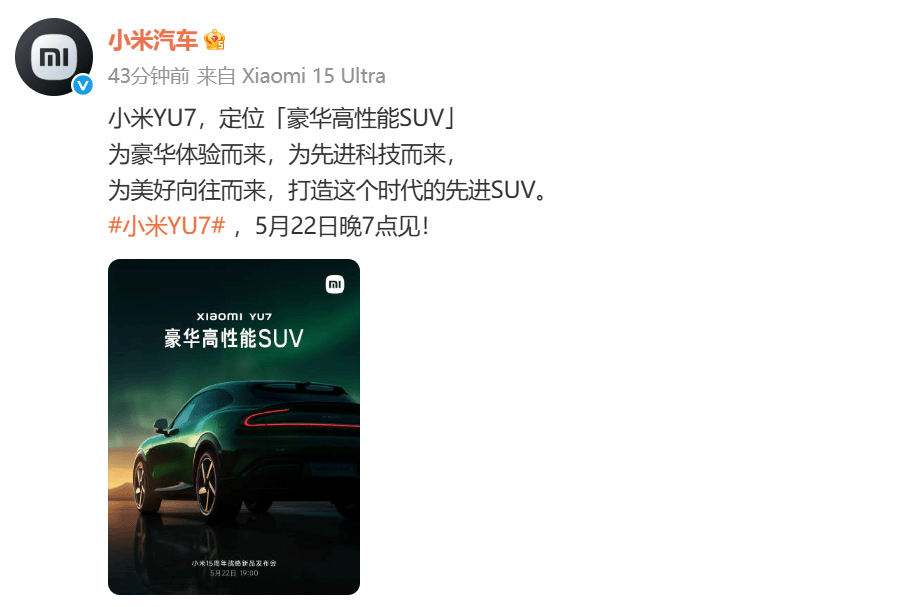 小米汽车同日发文称,小米YU7,定位「豪华高性能SUV」。为豪华体验而来,为先进科技而来,为美好向往而来,打造这个时代的先进SUV。小米YU7 ,5月22日晚7点见!