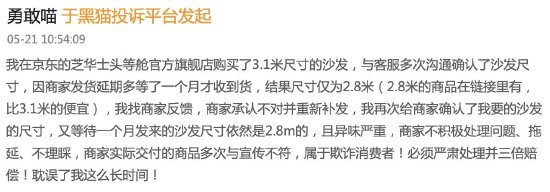 5月21日,《5D调查》在黑猫投诉 【下载黑猫投诉客户端】发现,有消费者投诉在京东购买的芝华仕沙发两次收货均出现尺寸不符、商品质量的问题,且商家处理过程拖延推诿,引发消费者强烈不满。事件持续两个月未妥善解决,消费者指责商家涉嫌欺诈,并要求三倍赔偿。