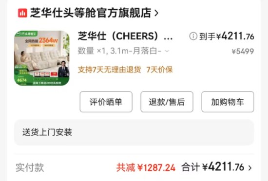 4月初,山东青岛的王先生通过京东平台“芝华仕头等舱官方旗舰店”购买了一款标称长度为3.1米的沙发。彼时正值促销活动叠加政府消费补贴,王先生最终以4211.76元的价格下单。购买前,他多次与客服确认沙发的尺寸和发货时间,客服承诺商品将按时送达。然而,商家因故延期发货,直至4月底,王先生才收到沙发。